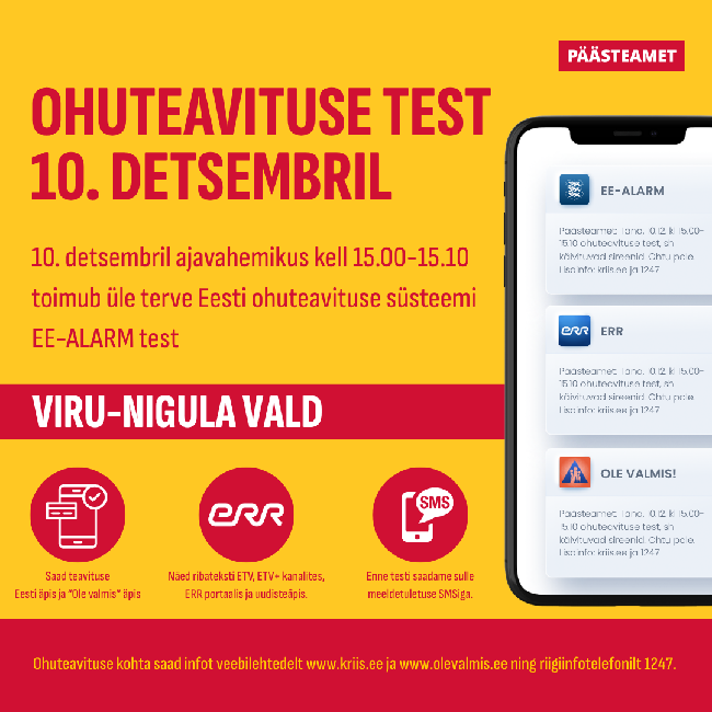 Päästeamet testib kolmapäeval, 10. detsembril ohuteavituse süsteemi EE-ALARM . Sel  päeval käivitatakse kõik ohuteavituse kanalid, sh sireenid (vaata sireenide asukohti  ...