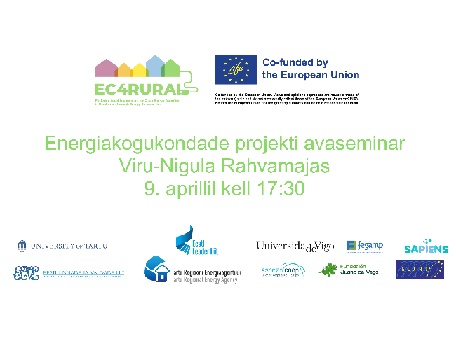 Kui soovid rohkem teada saada kogukondlikust energiatootmisest, oled oodatud osalema EC4RURAL projekti avaseminaril. Rohkem infot leiab Eesti LEADER Liidu kodulehelt ja Facebooki lehelt