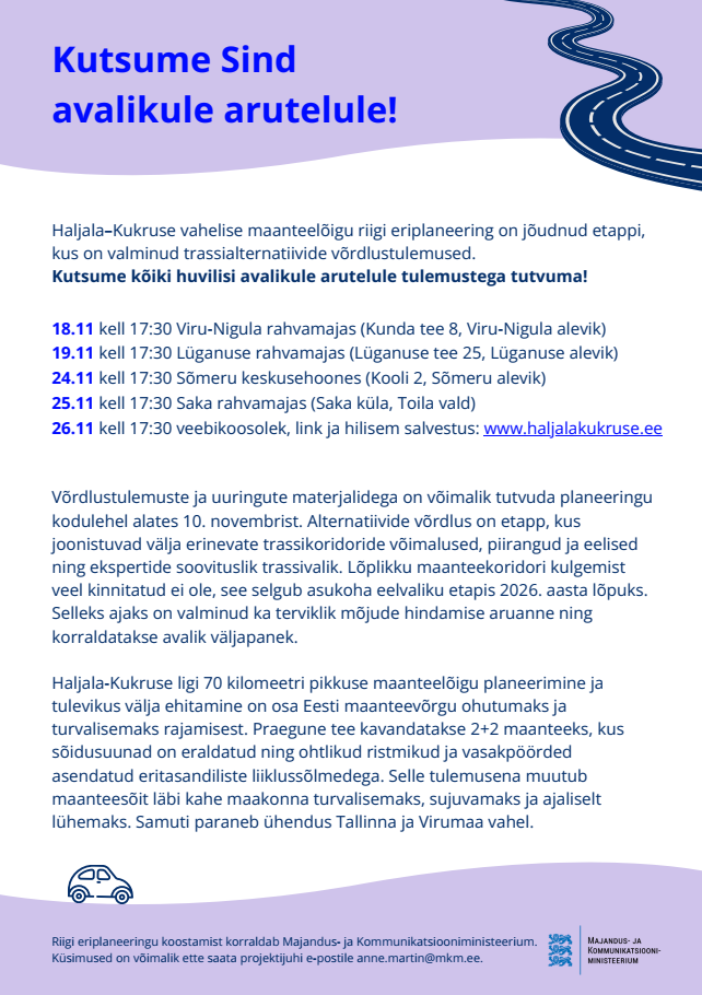 Haljala–Kukruse vahelise maanteelõigu riigi eriplaneering on jõudnud etappi, kus on valminud trassialternatiivide võrdlustulemused. Kõik huvilised on oodatud avalikele aruteludele uuringute...