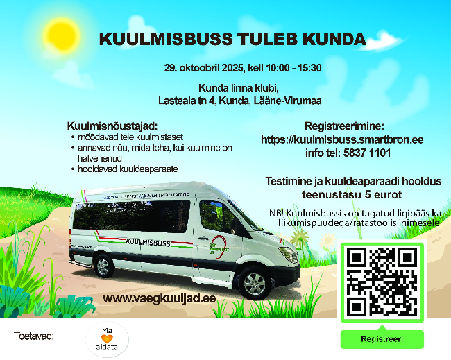 2 9. oktoober 2025 kell 10:00 – 15:30 Kunda linna klubi, Lasteaia tn 4, Kunda, Lääne-Virumaa Kuulmisnõustajad: mõõdavad teie kuulmist ...