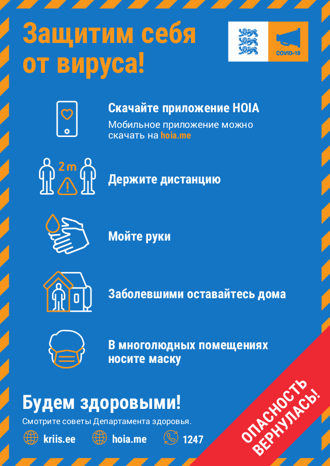 | Kehtivad piirangud | COVID-19 sümptomid ja käitumisjuhised | RIIGI INFOTELEFONID | EL digitaalne COVID tõend | Vaktsineeri koroona vastu / Пройдите вакцинацию от коронавируса | Hoiame viiruse eemal! / Защитим себя от вируса! | OLE VALMIS