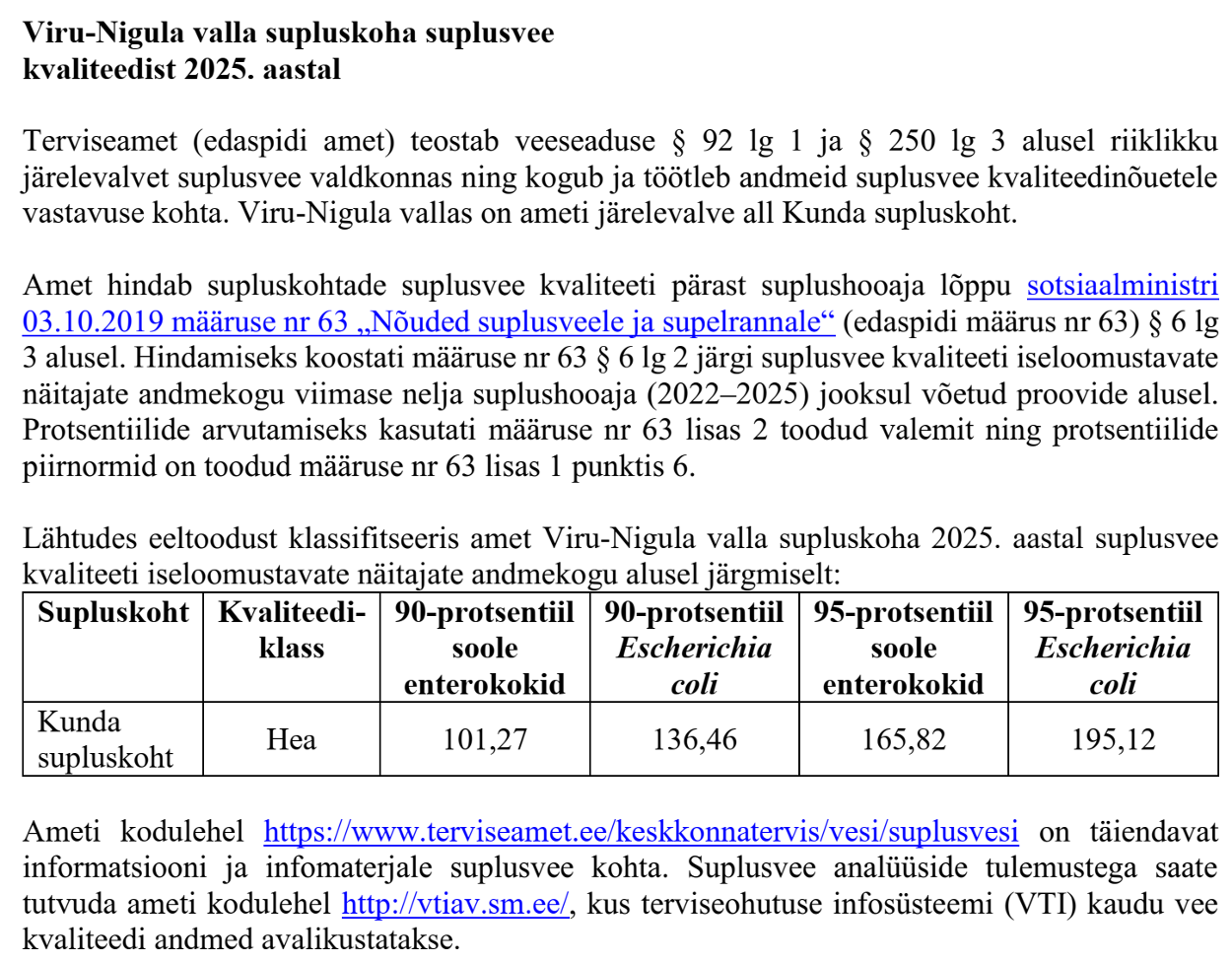 Viru-Nigula valla supluskoha suplusvee kvaliteedist 2025.aastal